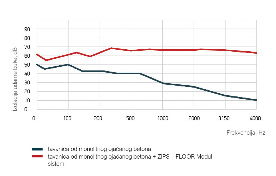 - Dodatni indeks izolacije od udarne buke za ZIPS Floor Modul sistem je 32 dB
